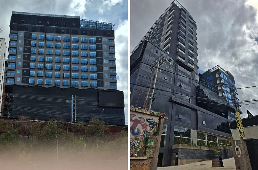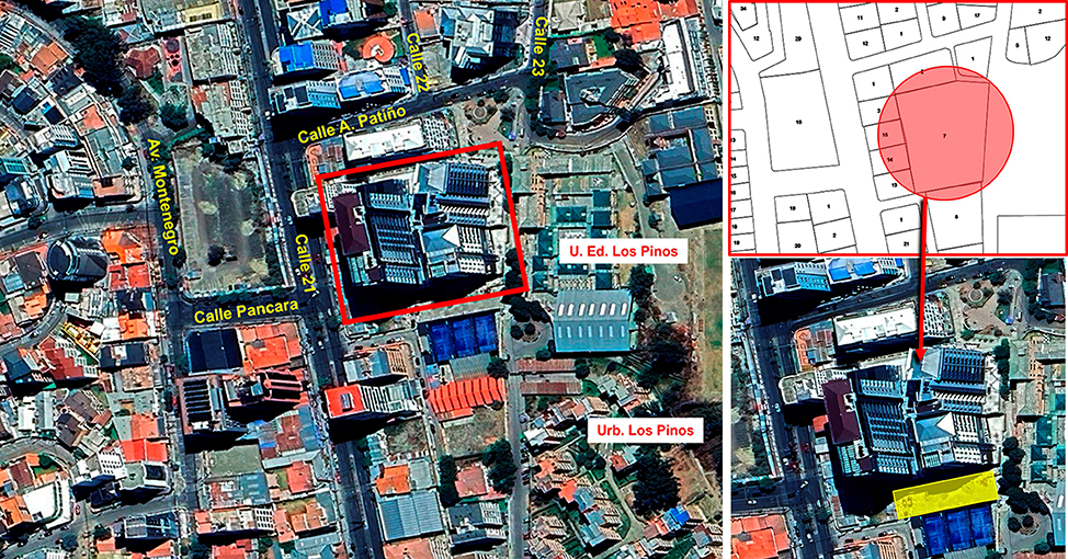 Un notorio edificio aún en construcción o en etapa de conclusión (ver pie de página[2]), ubicado sobre un terreno de más de 4.000 metros cuadrados de superficie, entre San Miguel y Los Pinos, precisamente colindante con esta urbanización, según la norma de la LUSU con Patrón de Asentamiento Zona Sur 4-d19 que establece una ocupación (AMC) de 50% de la superficie del terreno y una altura permitida (AMF) de 6 plantas, pero, con opción de aplicar “incentivos a la inversión” por las dimensiones del predio para alcanzar una altura de 8 plantas y Área Mínima Verde (AMV) 40% de la superficie del terreno.