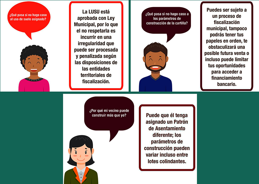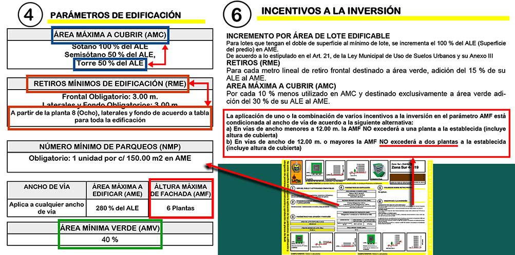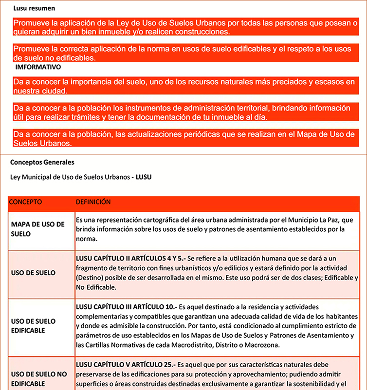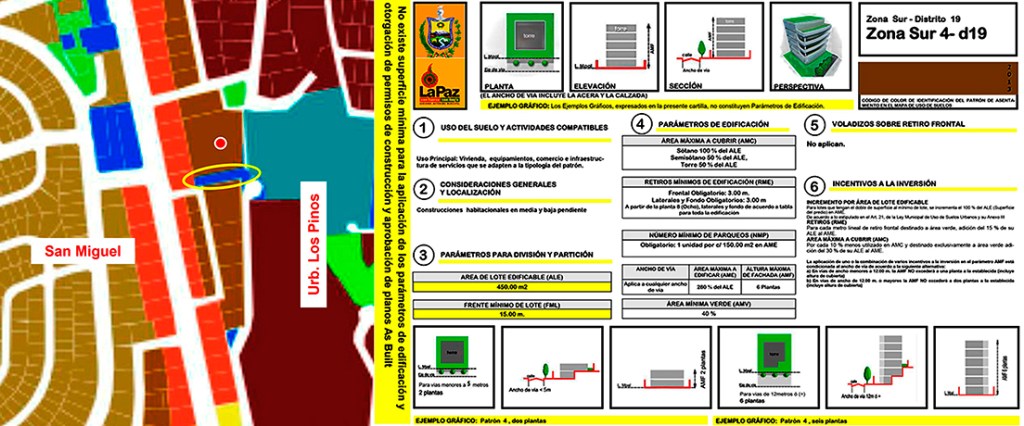 La Ley de Usos del Suelo Urbano – LUSU o Ley Autonómica Municipal 017/2012, aprobada en el Concejo el 2 de mayo de 2012 y “promulgada de oficio” por el Concejo el 25 de septiembre de 2012 (https://sitservicios.lapaz.bo/) modificada, actualizada y complementada con las leyes 050/2013 y 080/2014, contiene el conjunto de normas y reglas para la ocupación ordenada del suelo y las condiciones que deben cumplir las edificaciones que hacen la ciudad con patrones de asentamiento y parámetros para la ocupación del predio (AMC), superficie máxima de edificación (AME), altura (AMF), retiros, parqueos requeridos y área verde (AMV).