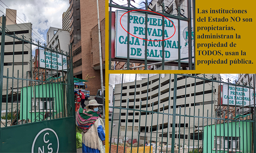 El 2 de enero de 2019 publiqué una entrada con el título: «Las instituciones públicas NO son propietarias», haciendo notar un problema de errónea interpretación de la ley respecto de derecho propietario y uso de la propiedad pública. Esta imagen muestra algo que encontré en el centro (Av. Mariscal Santa Cruz esquina calle Socabaya) que confirma ese error de interpretación con el que las instituciones (la Caja Nacional de Salud en este caso) se abrogan derechos de libre disponibilidad de la propiedad pública que no son legales.